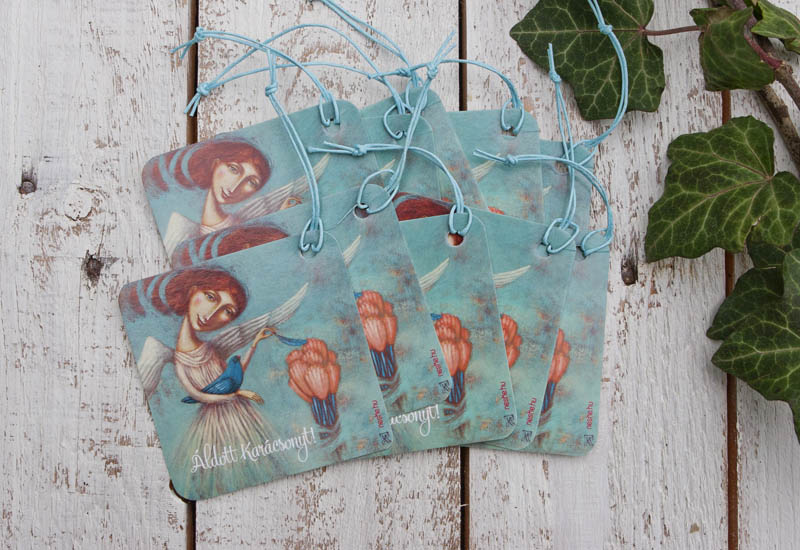 Karácsonyi ajándékkísérő kártyák, 300 g-os képeslapkartonra nyomtatva, Angyali érintés című festményem felhasználásával. Hátoldaluk üres. 10 db-os csomagban, átlátszó tasakban kapod.