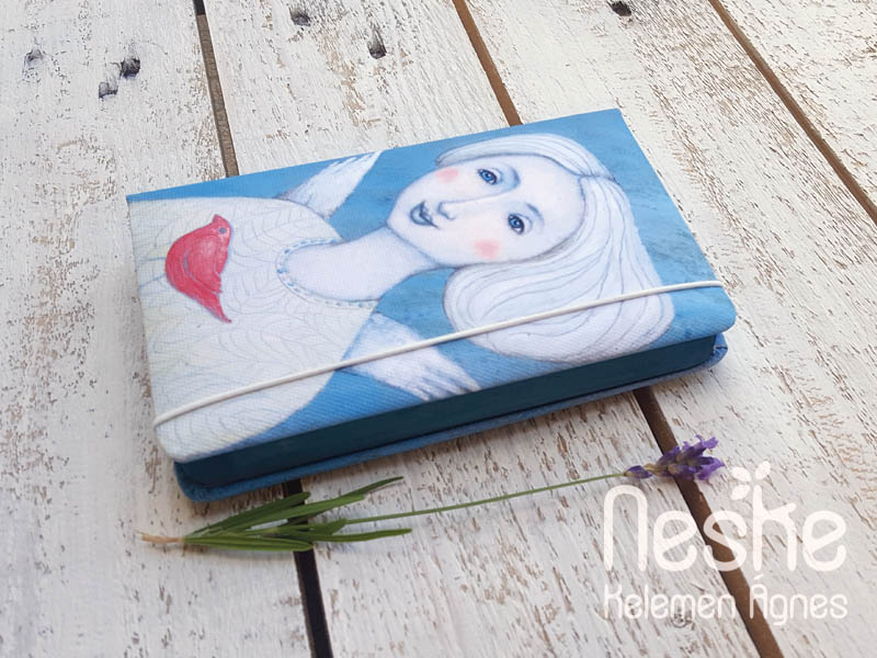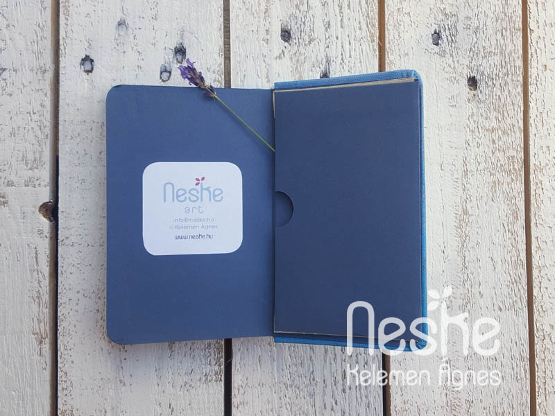 Egyedi kézműves kivitelben, saját könyvkötőműhelyünkben, természetes anyagok felhasználásával, lekerekített, kemény fedéllel készült. A notesz gumiszalaggal záródik. A könyvtest maga erős cérnával fűzött ívekből áll. Két jelzőszalag segít abban, hogy ott nyíljon ki, ahol legutóbb becsuktuk. A sima, nyomatlan belső oldalak papírja famentes, finoman érdes, natúr színű, jó írófelületű akár golyóstoll, hagyományos töltőtoll vagy ceruza használatához. A könyvtábla belsejére a külső illusztrációval harmonizáló előzékpapír került. A notesz végén elhelyezett tasak alkalmas kisebb fényképek, cetlik megőrzésére.