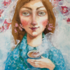 A NŐI LÉLEKMINTÁK sorozat kis (13 x 18 cm) képeinek inspirációjául a dédapám által a 20-as években épített Laszgallner-villában az oszlopfőkről ma is minket figyelő családi arcképek szolgáltak. Új sorozatom női portréi csillogó szemmel tekintenek vissza nagyanyáink és dédanyáink korába, emlékeztetve minket a női lélek családot összetartó erejére.