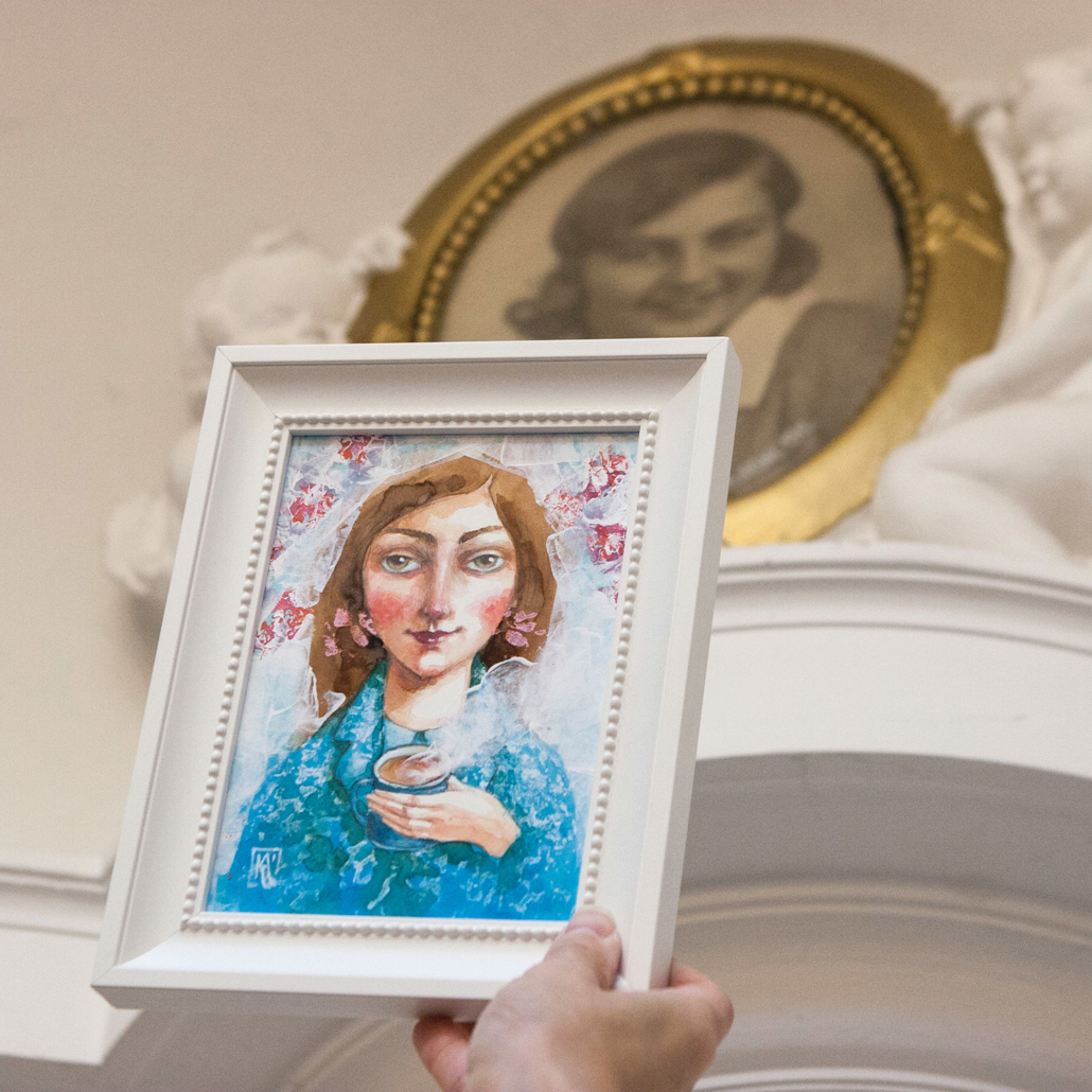 A NŐI LÉLEKMINTÁK sorozat kis (13 x 18 cm) képeinek inspirációjául a dédapám által a 20-as években épített Laszgallner-villában az oszlopfőkről ma is minket figyelő családi arcképek szolgáltak. Új sorozatom női portréi csillogó szemmel tekintenek vissza nagyanyáink és dédanyáink korába, emlékeztetve minket a női lélek családot összetartó erejére.