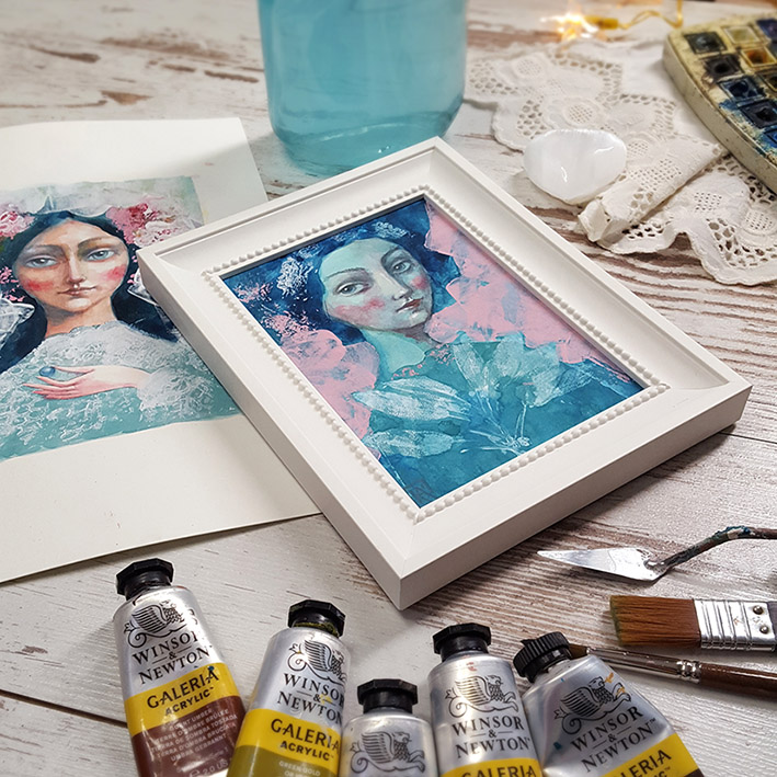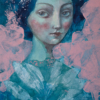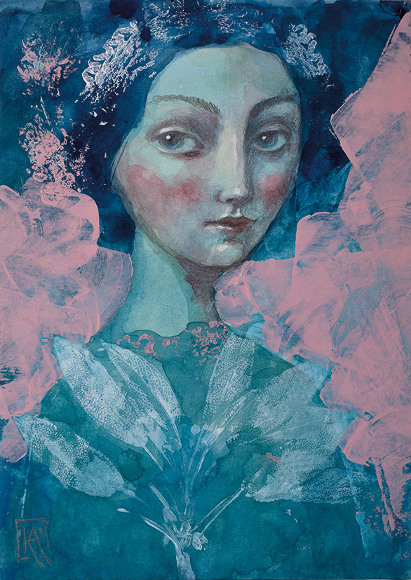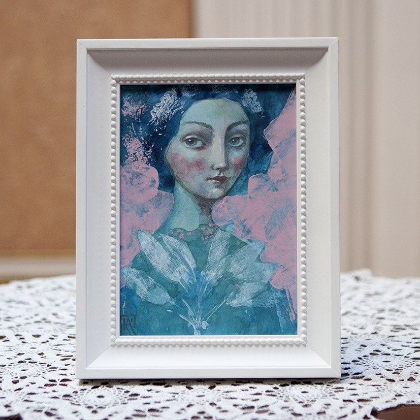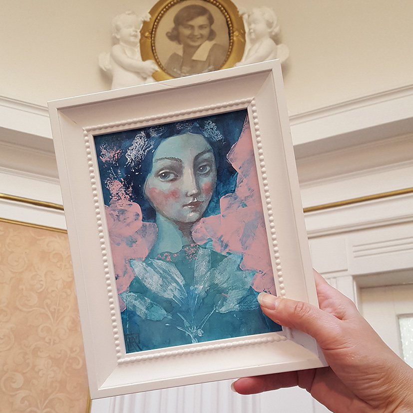 A NŐI LÉLEKMINTÁK sorozat kis (13 x 18 cm) képeinek inspirációjául a dédapám által a 20-as években épített Laszgallner-villában az oszlopfőkről ma is minket figyelő családi arcképek szolgáltak. Új sorozatom női portréi csillogó szemmel tekintenek vissza nagyanyáink és dédanyáink korába, emlékeztetve minket a női lélek családot összetartó erejére.