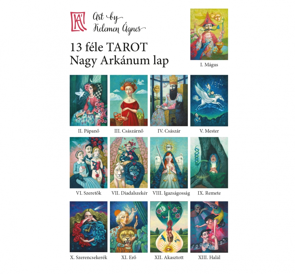 A csomag 13 féle TAROT Nagy Arkánum lapot tartalmaz, mély, élénk színekkel 300 grammos, tört fehér kartonra nyomtatva. Minden kép alatt a lap jelentését összefoglaló verses gondolatsor található.