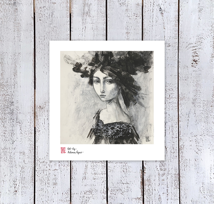 Lány fekete csipkeruhában című vegyes technikával készült professzionális digitális, szignált nyomat. Gyönyörű mély, élénk színek. 240 grammos, tört fehér kartonra nyomtatva.